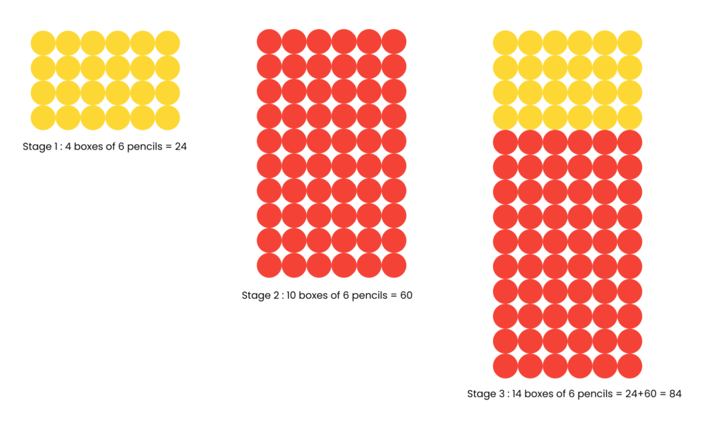 Next, we explore 10 boxes of 6 pencils, again using manipulatives or pictures to reason and demonstrate thinking. This allows students to refine their approaches, compare strategies and begin noticing patterns. Finally, I pose a larger challenge, 14 boxes of 6 pencils. Students grapple with the problem, discuss strategies, and slowly discover that breaking 14 into 10 and 4 makes the calculation more manageable. They calculate 10 × 6 and 4 × 6 separately and then combine the results. Using manipulatives, drawings, pictures, etc. makes the numbers tangible and supports students in actively constructing understanding rather than memorising facts.